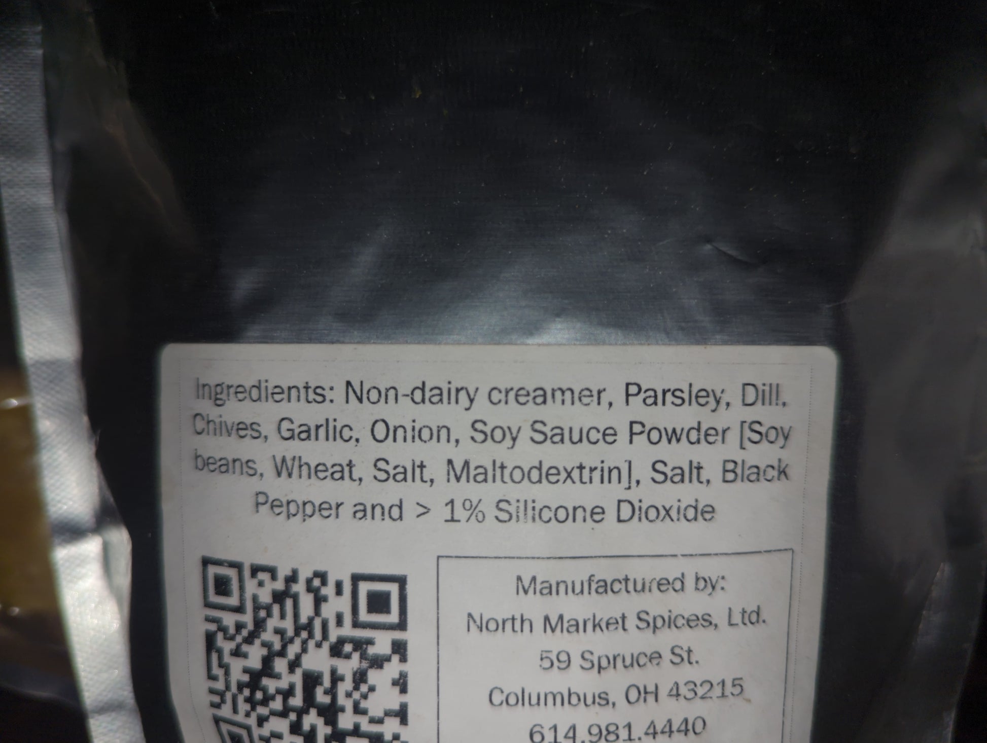 Ingredients: Non Dairy Creamer, Parsley, Dill, chives, garlic, onion, soy sauce powder [Soybeans, Wheat, Salt, Maltodextrin], Salt, Black Pepper and >1% Silicone Dioxide